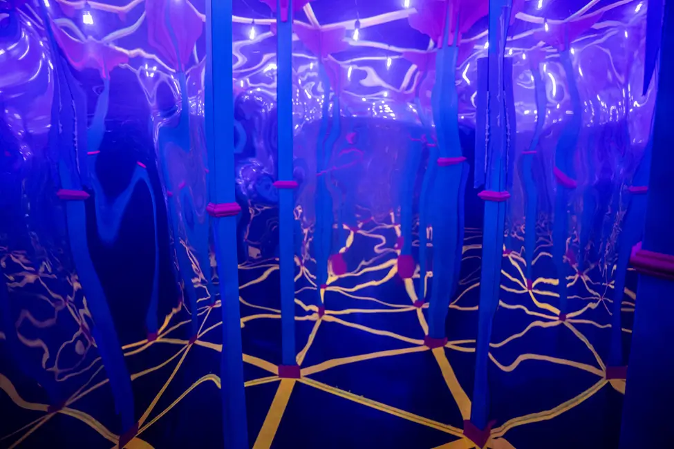 Plunge into a whirlwind of dazzling lights, emerging in a chaotic strobe-lit room where glowing black-light patterns seem to dance around you. Giant dayglo cranks line the walls, beckoning you to turn them. One crank, driven by the fast-paced jack-in-the-box tune, triggers the ultimate surprise—pop!—as a gust of air unveils a secret exit, propelling you further into the disorienting funhouse journey.